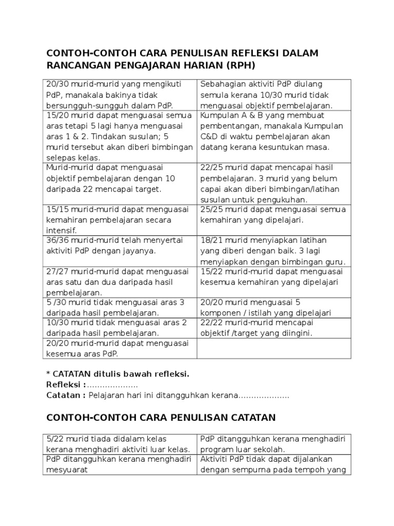 Catatan refleksi sepatutnya mengandungi perkara-perkara berikut. Cara penulisan refleksi yang mudah tepat ringkas untuk rph guru guru buku. Catatan refleksi sepatutnya mengandungi perkara-perkara berikut.